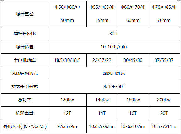 三~五層共擠(上吹牽引旋轉)薄膜吹塑機組為了滿足客戶對高品質、高產吹膜的設備要求,采用了帶有強制進料功能的擠出機、緊密型雙風口風環、水平式旋轉牽引系統、IBC膜泡內冷系統、全自動雙剖雙收表面摩擦收卷機、計算機集中控制系統等先進技術和裝備。與同類設備相比,具有結構緊湊、產量更高、制品質量更好、機器更節能、操作跟簡便等優點,可以廣泛用于各類高透明性包裝薄膜的生產,為您創造可觀的經濟效益。主要技術參數: