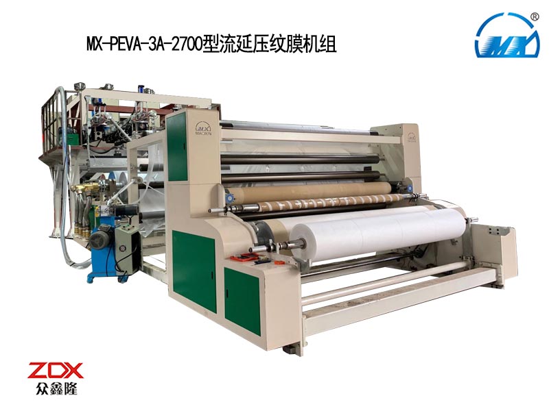本機組特點:全伺服驅動控制系統,高效節能,操作簡便,整機西門子可編程控制,模塊化設計,檢修方便,故障自動提示。本機組可生產PE,EVA等材料流延壓紋膜,產品廣泛應用于西裝套、浴簾、一次性手套,服裝包裝袋等產品。