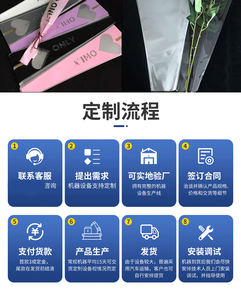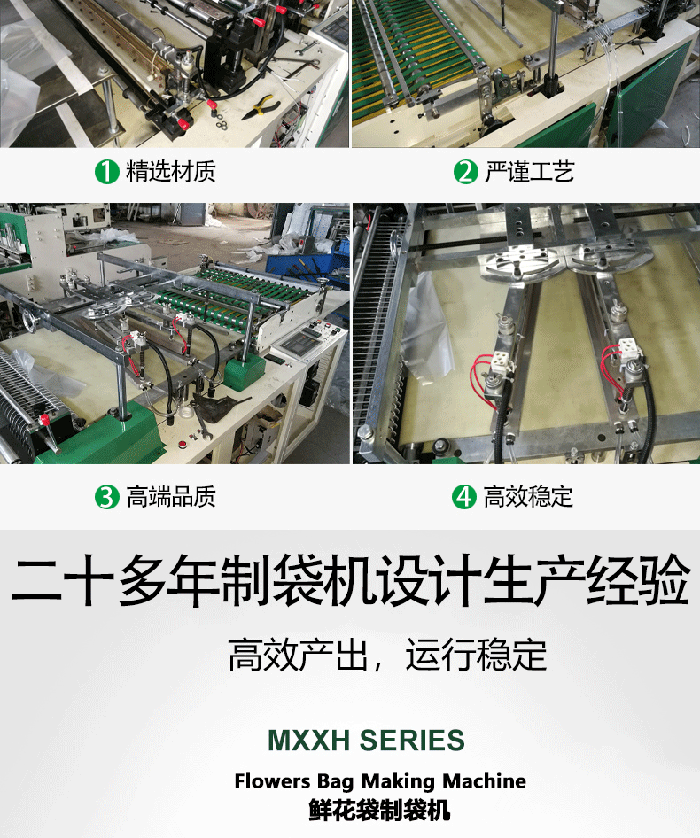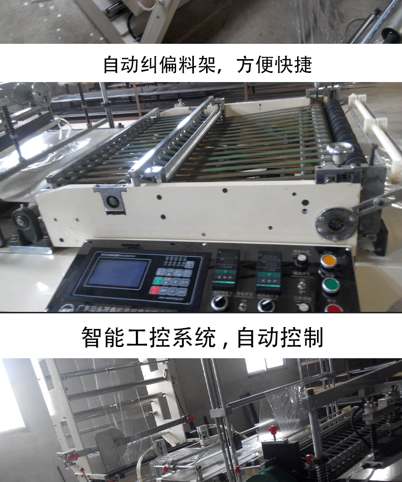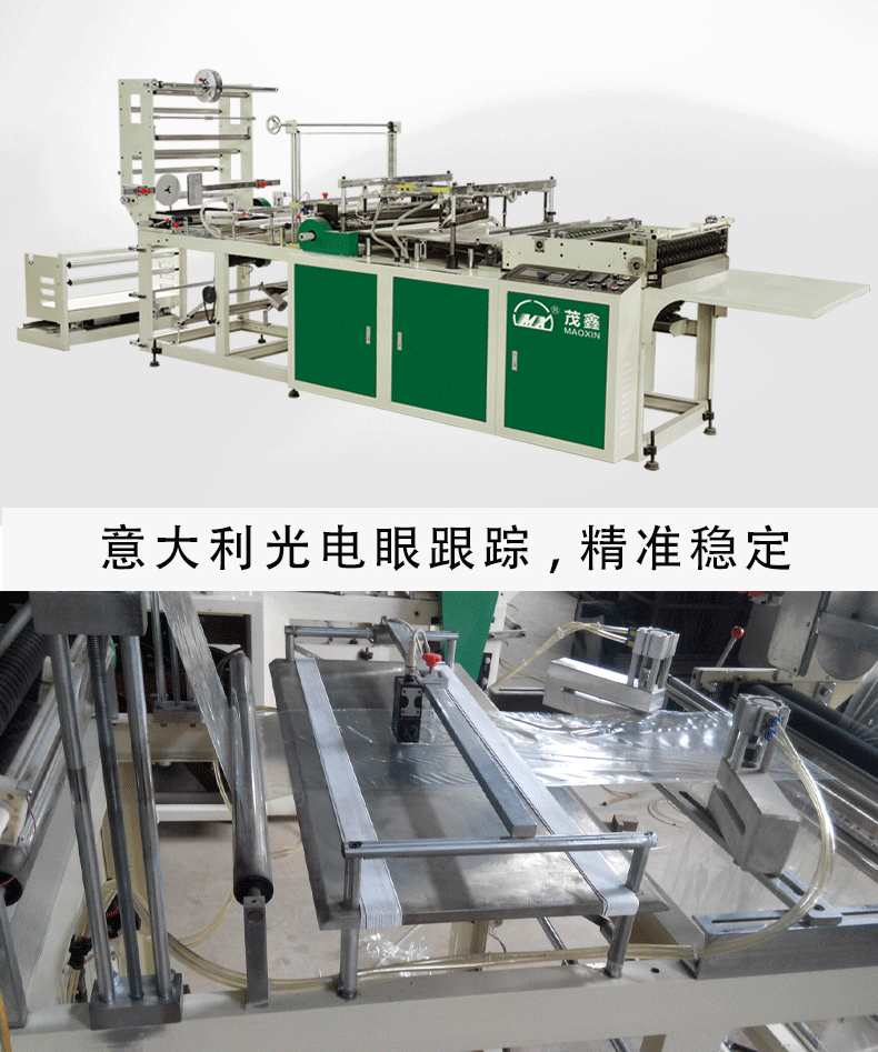 | 特點: *該機適用于BOPP、OPP、CPP、PE、PP等熱塑料性薄膜進行自動連續加工異形熱切袋,適用于制作服裝袋、文具袋、鮮花袋、三角袋等。 *采用日本伺服馬達控制,主電機采用臺灣變頻調速,意大利光電眼跟蹤彩印,出袋輸送裝置采用進口皮帶及臺灣變頻調速。 *放料架配置自動糾偏、磁粉制動張力控制系統。 *采用高精度控溫儀自動控溫,使不同厚度的膜都能保證封線牢固美觀。 *熱切刀采用進口耐熱鋼鍛造,高溫加熱不易變形,封棍采用耐高溫硅膠材料。 *電腦控制系統具有自動計數,累計數,提前報警,暫停等功能,自動控制開停機。 *根據客戶加工不同袋樣,可更換異形刀模具。 *由于不斷研究改進,我司保留改變設計之權利。 |